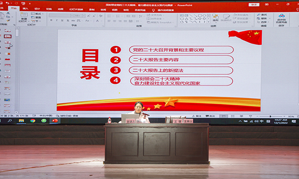 会上,郭玉华围绕党的二十大召开的背景和主要议程,二十大报告主要内容,二十大报告上的新提法,深刻领会党的二十大精神奋力建设社会主义现代化强国四个方面对党的二十大精神进行了深入浅出的讲解,系统阐释了党的二十大精神的重大意义、过去5年工作和新时代10年伟大变革意义、习近平新时代中国特色社会主义思想的世界观和方法论、把握以中国式现代化推进中华民族伟大复兴的使命任务等,推动我院广大教职工准确领会把握党的二十大精神。