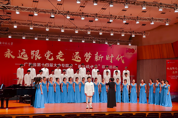5月21日至22日,由广东省教育厅主办、以“永远跟党走,逐梦新时代”为主题的第十四届大中专“百歌颂中华”歌咏比赛决赛在广州大学城华南师范大学音乐厅举行。本次决赛分为合唱比赛和歌手大赛,共有57所大中专院校派出队伍或选手参与。经过激烈竞逐,我校william英国中文海之声合唱团和研究生景竹薪同学分别在合唱组和歌手组中夺得一等奖。