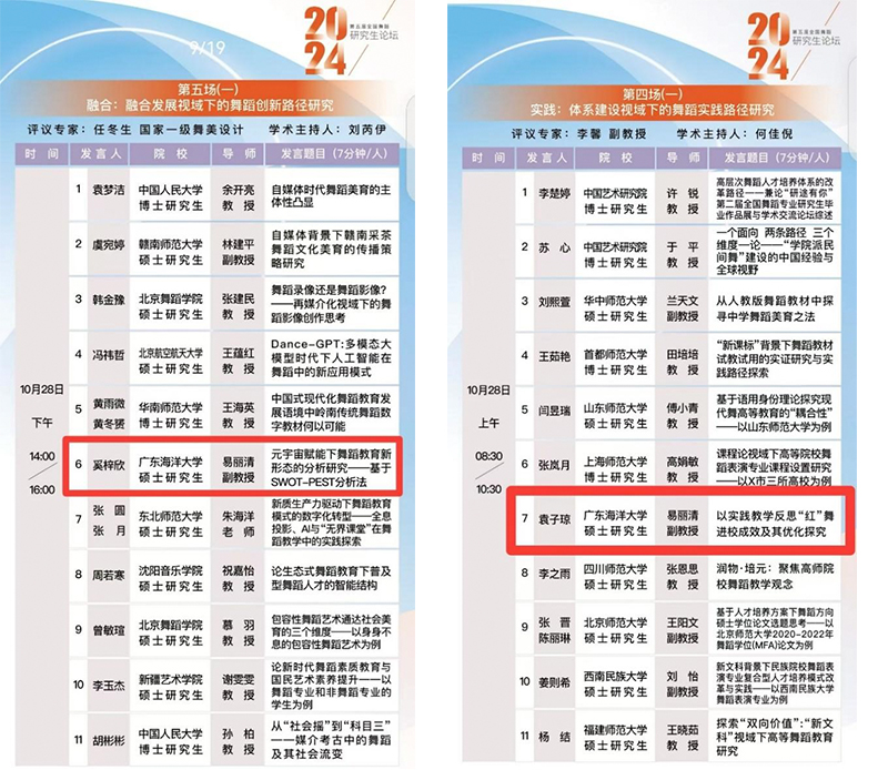 截止到收稿时间,本次论坛共收到了198篇来自国内外院校的舞蹈博士、硕士研究生投稿论文,经过专家评议,95篇论文入选本届论坛。我院2022级舞蹈专业研究生奚梓欣和袁子琼两位同学撰写的论文《元宇宙赋能下舞蹈教育新形态的分析研究——基于SWOT-PEST分析法》、《以实践教学反思“红”舞进校成效及其优化探究》成功入选。