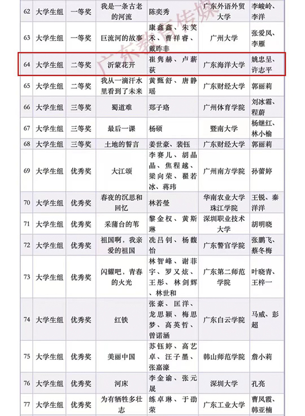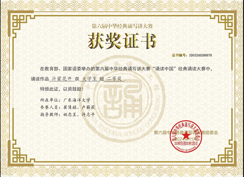 近日,在教育部、国家语委主办的第六届中华经典诵写讲大赛“诵读中国”经典诵读大赛中,我院教师姚忠呈指导学生的诵读作品《沂蒙花开》脱颖而出,荣获全国大学生组二等奖。