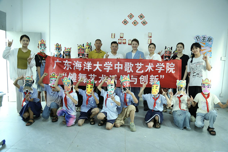自"双百行动"启动以来,我院党委书记欧卫军,“双百行动”服务队队长赵裕彬,我院副院长刘迪、舞蹈系主任许笑傲带领本硕学生团队深入麻章旧县,通过"高校+地方"结对模式开展文化振兴实践。团队首站走访湛江傩舞陈列馆,系统梳理千年傩舞历史文脉,采集传统面具、服饰、动作等文化基因。在旧县小学,"傩舞进校园"工程创新推出首套傩舞主题课间操,将驱邪祈福的"香火决"等经典动作转化为适合青少年的韵律操,让小学生们在强身健体中感悟文化根脉。